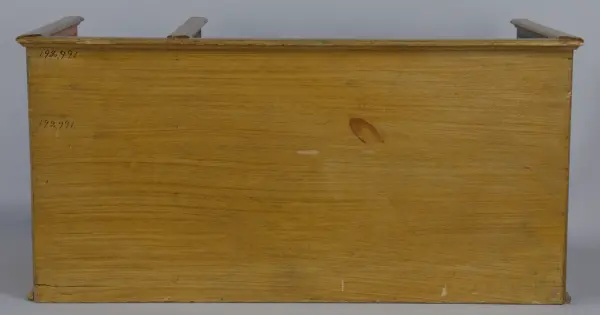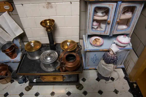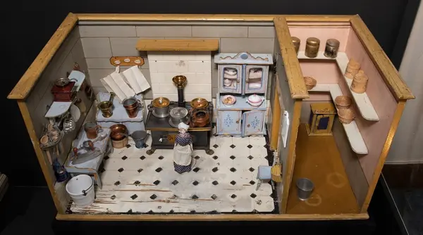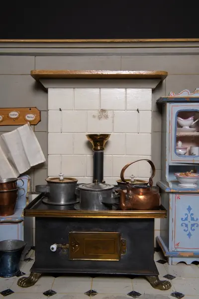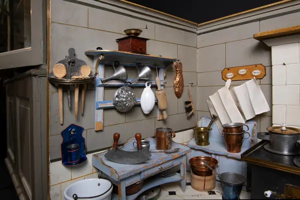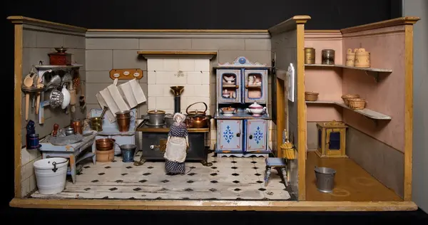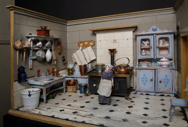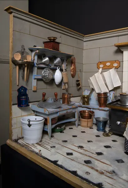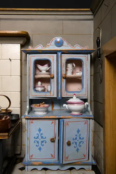 Dockskåp, köksdockskåp, av trä, skafferi och kök, utvändigt träådrat. Väggarna i köket kvadermålade och golvet svart och vitrutigt. Skafferiets väggar rosa, väggfasta hyllor, dörrposten ekimiterad.