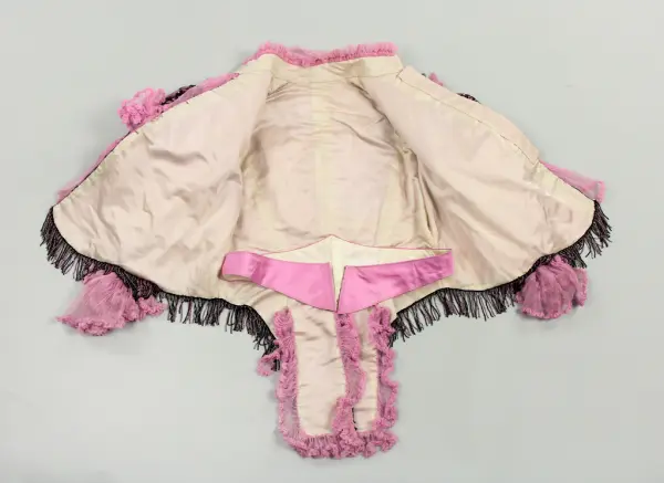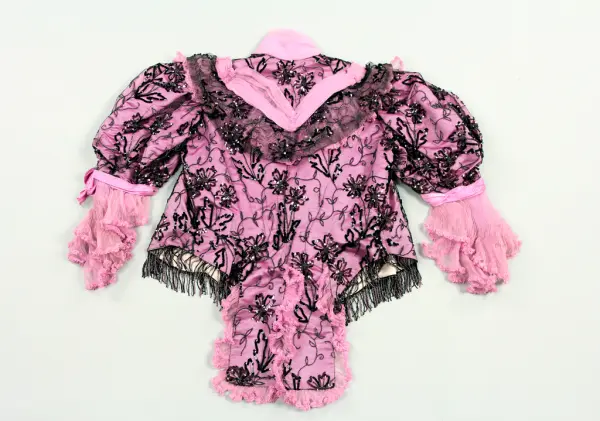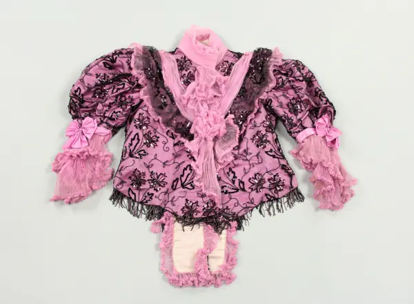 "Klänning, liv, kjol lila siden, svart pärl- och paljettborderad tyll, chiffon, halvlång puffärm, skärt, släp.