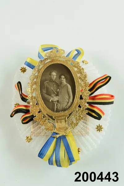 "Karamell, rektangulär, guldpapper; vit tyll, band i svenska och belgiska färger; m. bläck: 'Prinsessan Astrids och Kronprins Leopold av Belgiens förmälning i Stockholm den 4/11 1926´. Fot. av bröllopsparet. G. av förste hovintendenten Frans Ståhl, Stockholm 4/4 1935."