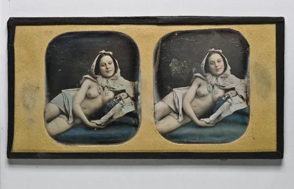"Daguerreotypi, stereoskopbild, handkolorerad, liggande obetydligt klätt fruntimmer; med blyerts: 'Daguerreotyp av Bergström Sthlm'; ink. från hovfotografen Oscar Halldin, Stockholm. Gåva 30/12 1935 av Nordiska museets vänner."
