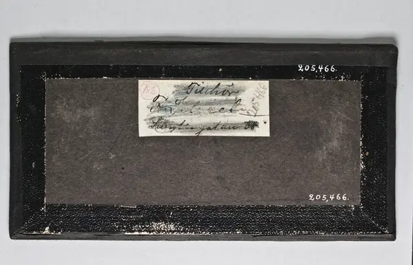 "Daguerrotyp, handkolorerad stereoskopbild. Föreställer ung lättklädd kvinna, liggande på sidan. Löst knuten sjal om huvudet och tunt skynke runt höfterna. Kantlist och bakstycke av svart papp. På bakstycket påklistrad papperslapp med bläckskrift: 'Tillhör /F. Scheele/ Sibyllegatan 38' (överstruket m. blyerts). Med blyerts längre ned: 'Daguerrotyp av Bergström Sthlm.' Passepartout i mönsterpressad guldpapp. Glasad."