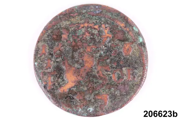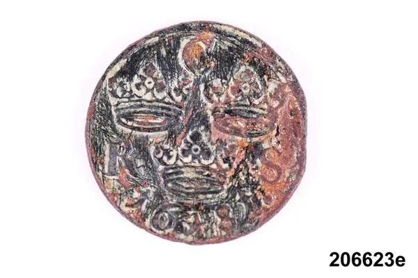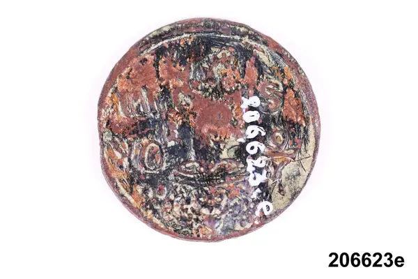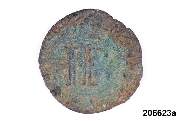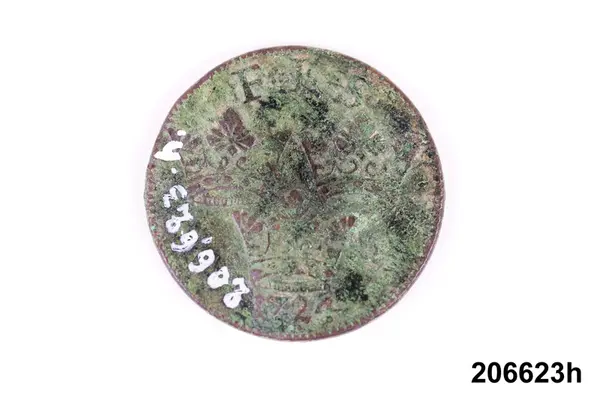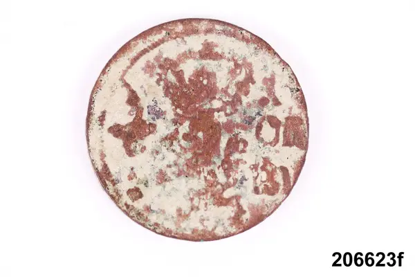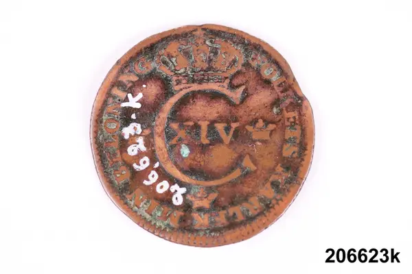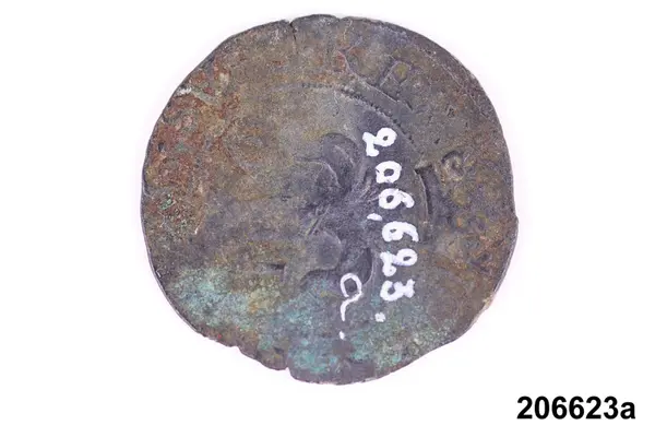 f) Mynt, koppar, 1/6 öre silvermynt, Karl XI, oläsligt årtal.