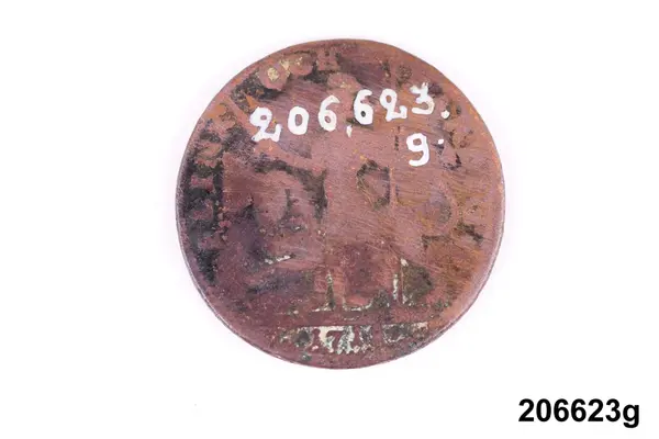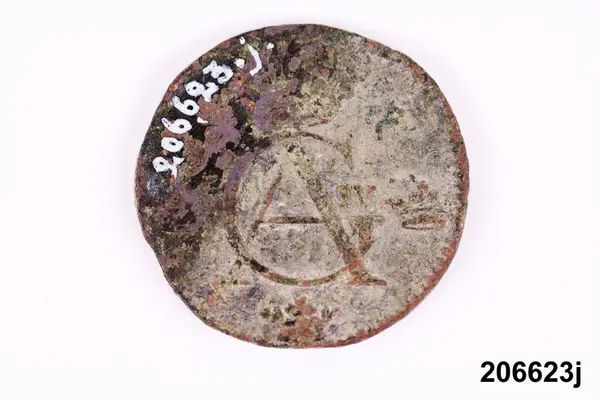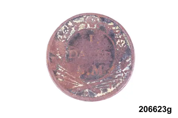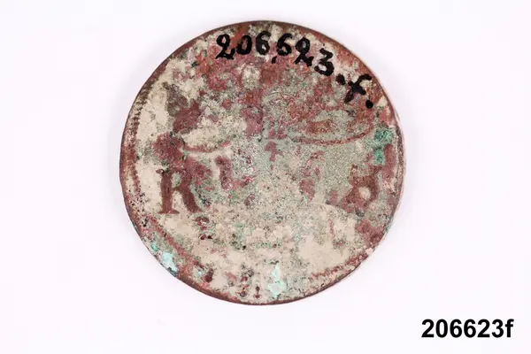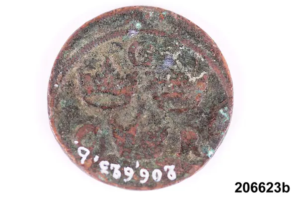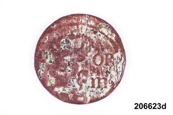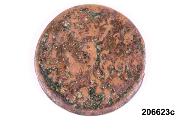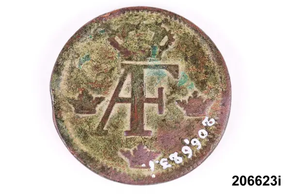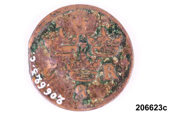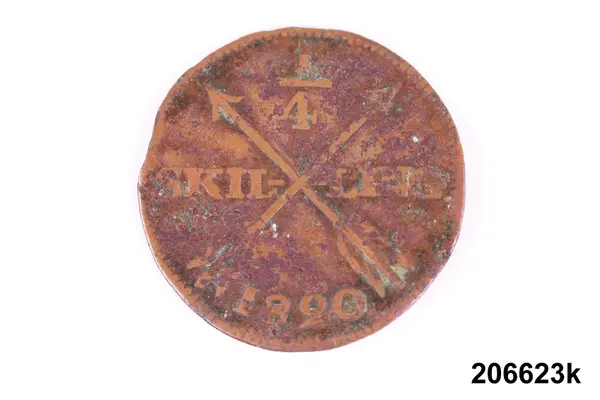 l) Riksgäldspollett, koppar, 1/4 skilling, oläsligt årtal.
