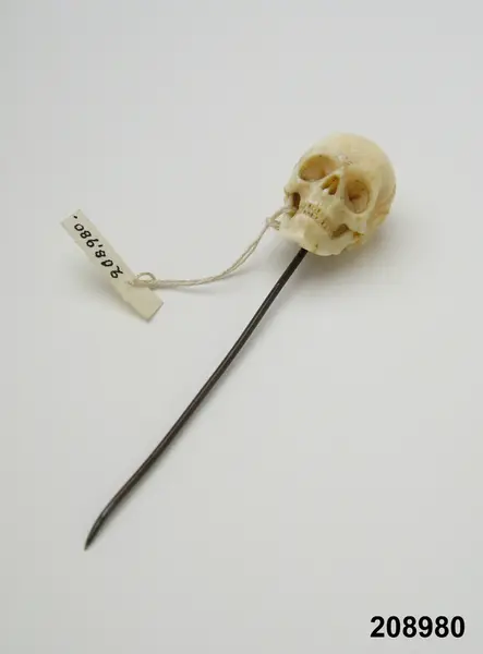 Kråsnålar som denna tillhörde välklädda mäns garderob från slutet av 1700-talet och fram till första halvan av 1900-talet, då slipsnålen tog över i klädmodet. Kråsnålen fick pryda kravatter och slipsar – och nålens huvud smyckades ofta av en pärla eller ädelsten. Anders Eliassons kråsnål är tillverkad av järn, och huvudet som bär form av en dödskalle är av ben."