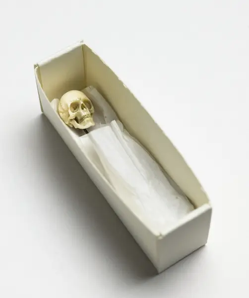 "Denna kråsnål, dekorerad med en dödskalle av ben, var förmodligen en gåva från författaren August Strindberg till överläkaren Anders Eliasson i Ystad. De två männen umgicks med varandra under 1890-talet, då Eliasson även hjälpte Strindberg med logi och pengar – men som en följd av Strindbergs förföljelsemani bröts vänskapen. Smycket skänktes långt efter Eliassons död till Nordiska museet.