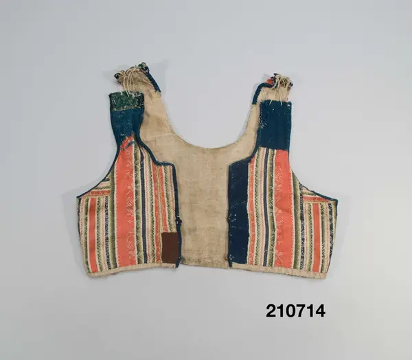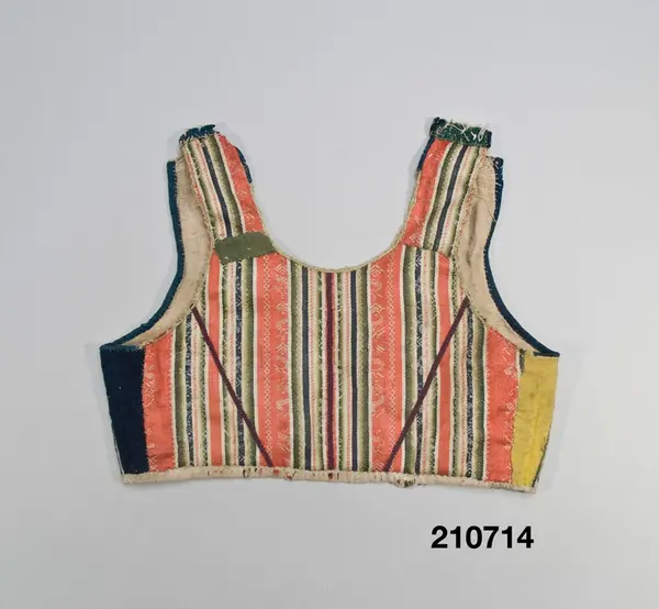 "Livstycke, kvinno, randigt i flera färger, linnedamast och ylle. Hyskor och hakar mässing, linnefoder; fr. Gruddbo, Sollerö sn, Dalarna. Från klädloftet i Mattsgården. I[nköpt] från Bond Meit, Mattsgården, Gruddbo, Sollerö, gm G. Hazelius-Berg jämte 210.710 - 210.759 [...]. 14/10 1937."