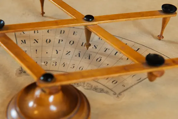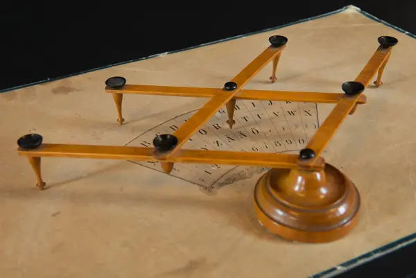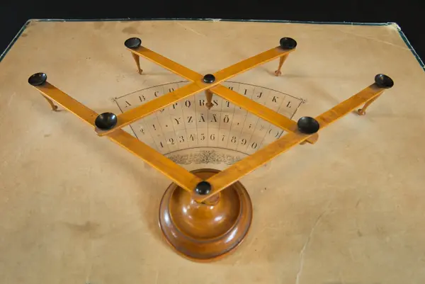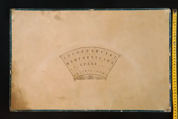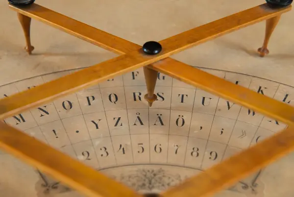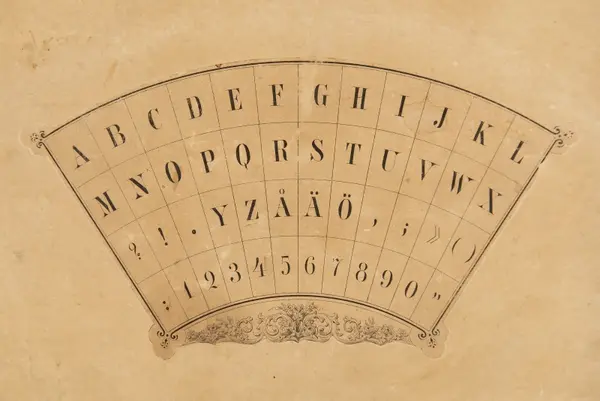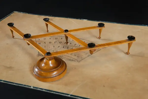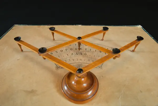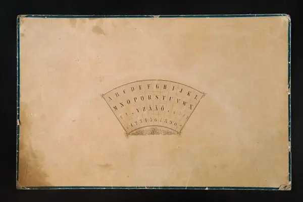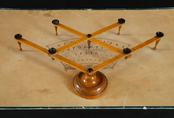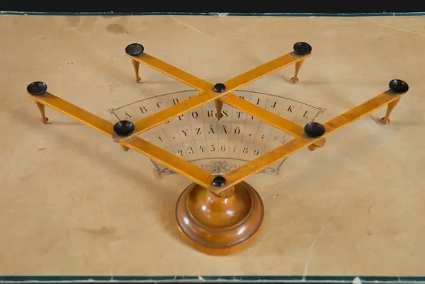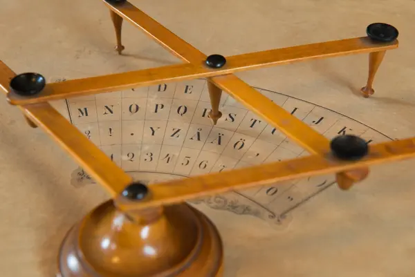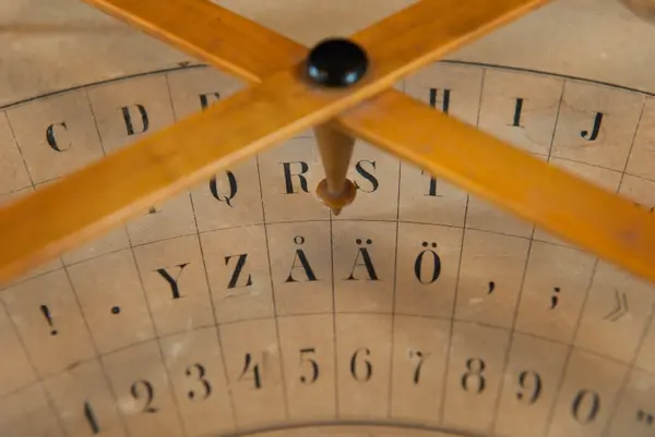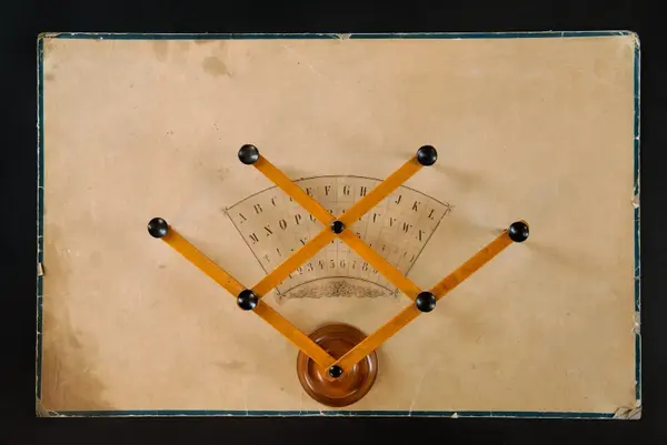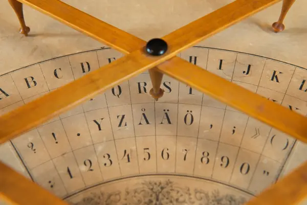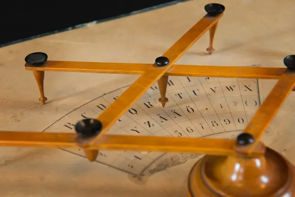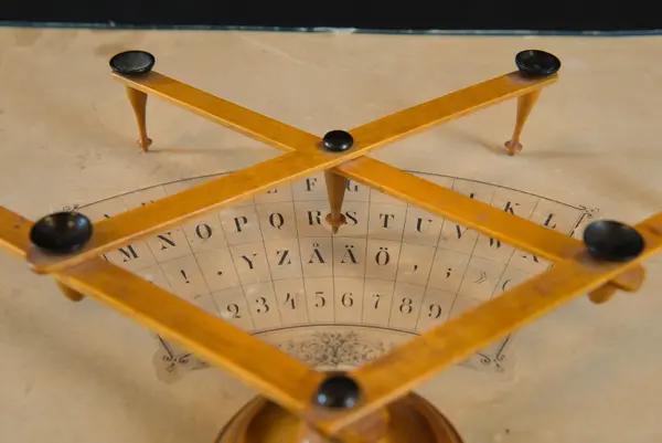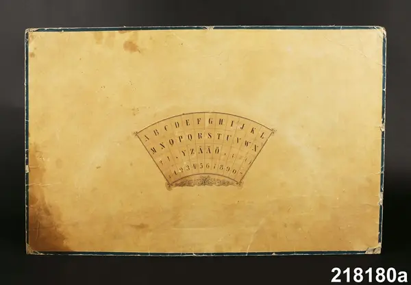 "Psykograf, rektangulär pappskiva, påklistrad papper med cirkelsektor med bokstäver och siffror.
