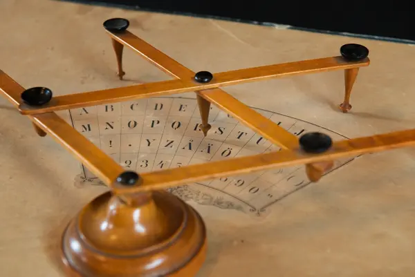 "Psykografmedier, som erhålla andemeddelanden genom psykograf eller något dylikt instrument ... Dervid tillgår så. att ett eller tvänne medier lätt stödja sina fingrar på instrumentet. Detta börjar då snart röra sig öfver ett underliggande papper, på hvilket alfabetet är uppritadt, och genom ett i instrumentet fäst pekstift angifves då bokstaf efter bokstaf i det meddelande, som skall göras."
