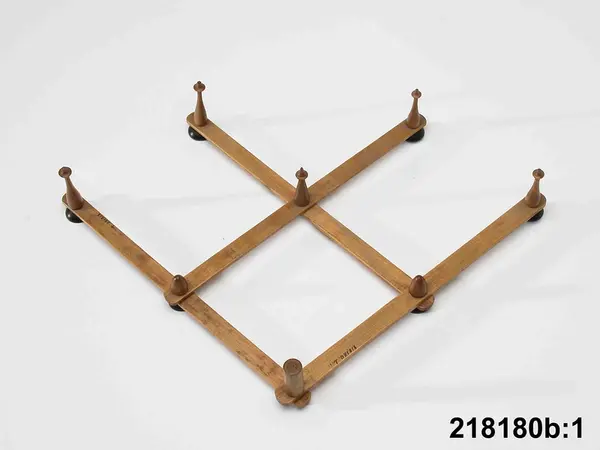 b) apparat, svarvad träfot, låg, rund, arm, rörlig, brunt trä med svarta skålar, 6 st, och 2 svarta knoppar, på undersidan svarvad, 5 spetsar av trä.