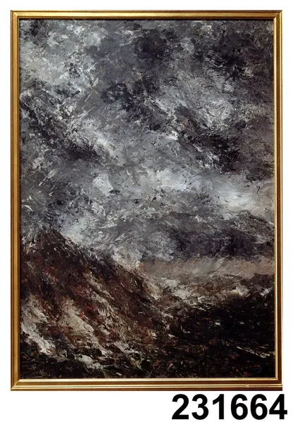 "Tavla, oljemålning på papp, föreställande 'Snöstorm på havet', signerad August Strindberg, Paris 1894. Förgylld träram. 51,5 x 70 cm. På baksidans kartong: August Strindberg/Paris Hösten 1894/Till Minne/ åt Herrskapen Fahlström. Gåva 20/10 1945 av fru Alma Fahlström, f. Bosse, Oslo."