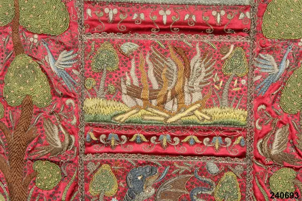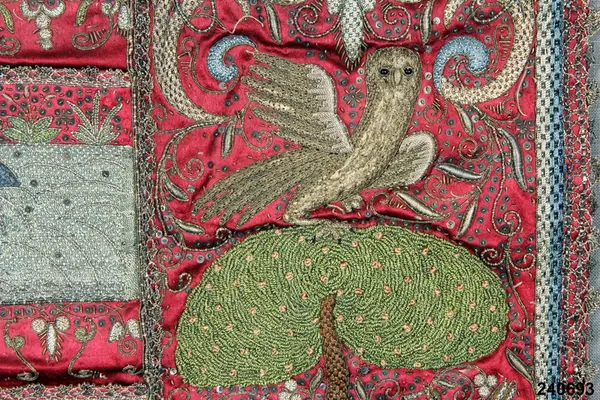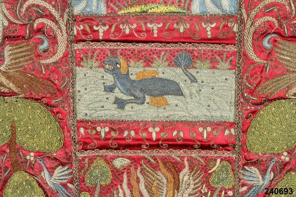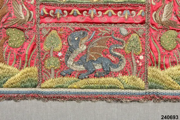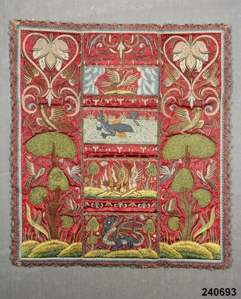 "Brevgömma, broderi med silke och metalltråd på rött siden, nästan yttäckande mönster med trädmotiv och drakar m.m. Fyra fack: Kantad överallt med metalltrådsspets. Gåva enligt testamente. Bilaga. Häradshövding, friherre Erik K:son Leijonhufvuds dödsbo, Stockholm."