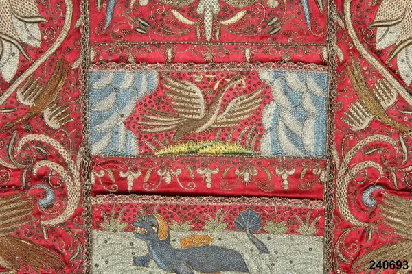 "den brevgömmebrodyr av guld och silvertråd på rött siden, som min moder erhållit i gåva av grevinan Sigrid Wachtmeister, född Flemming - ett tyskt arbete från slutet av 1500- eller början av 1600-talet."