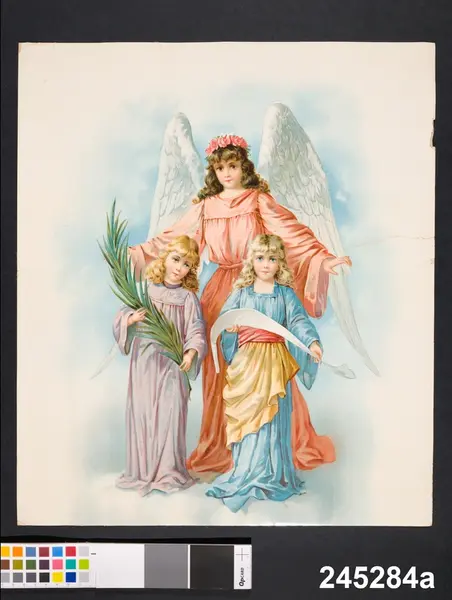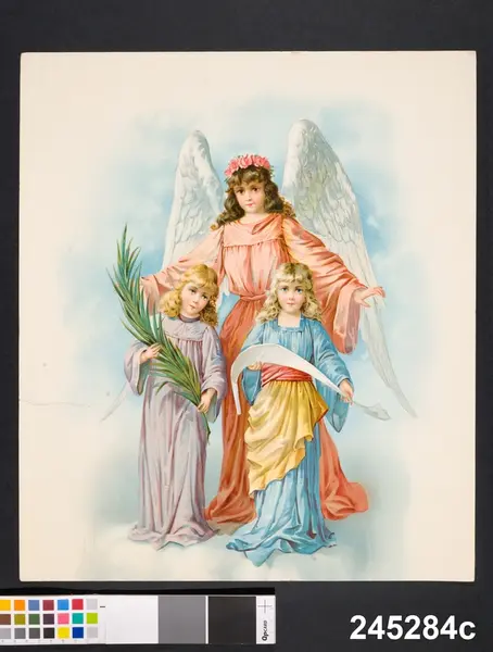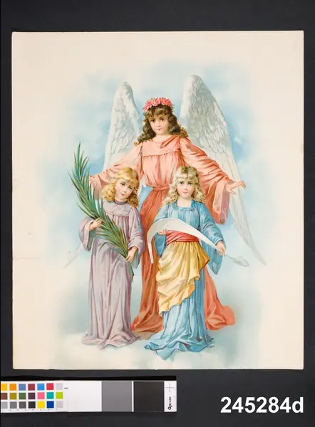 "Oljetryck, 4 st. lika, föreställande en ängel med stora vita vingar och framför henne 2 små flickor, den ena med plamkvist, den andra med utdragen textrulle. Rivna i kanten. "Tillhört "Hanna i Klyngan" hon sålde sådana förr och dessa har blivit över. Var 92 år vid sin död. Sålde bl.a konfekt, lemonad, öl. Vid 80 års ålder stämd sista gång, slapp fängelse då". Ink 2/9 1952 Fru Swea Jansson Urshult 6 kr."