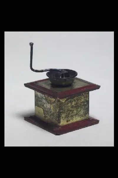 Speldosa, kaffekvarn, leksak, av bleckplåt, kubiskt gullackerat hus, utskjutande rödlackerad bottenplatta och tak, tratt ooch rörlig vev av metall. Knäppande ljud när man rör veven. Inköpt på auktion hos lanthandlare Lars Lundberg, Källeryd.