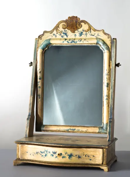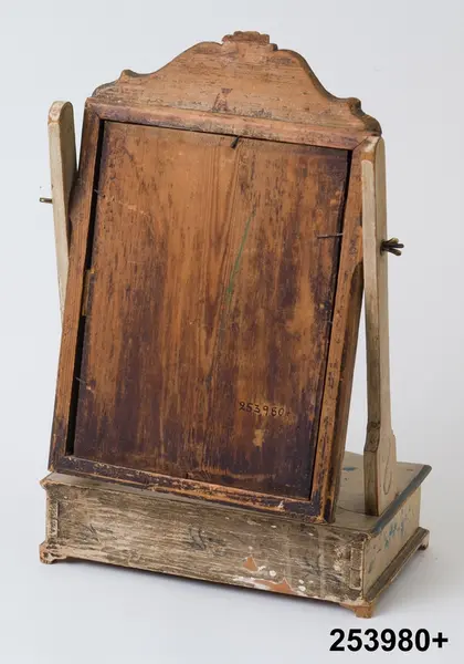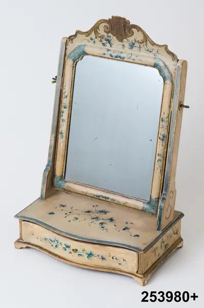 "Lådspegel målad ljust grågul med dekor i ljusblått och guld, signerad med brännstämpel 'IÅ' under krona på baksidan av spegelns överstycke, under lådans botten Stockholms hallstämpel 1772 eller 1773. H 47,5 cm