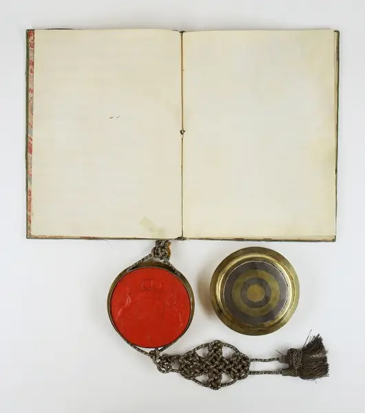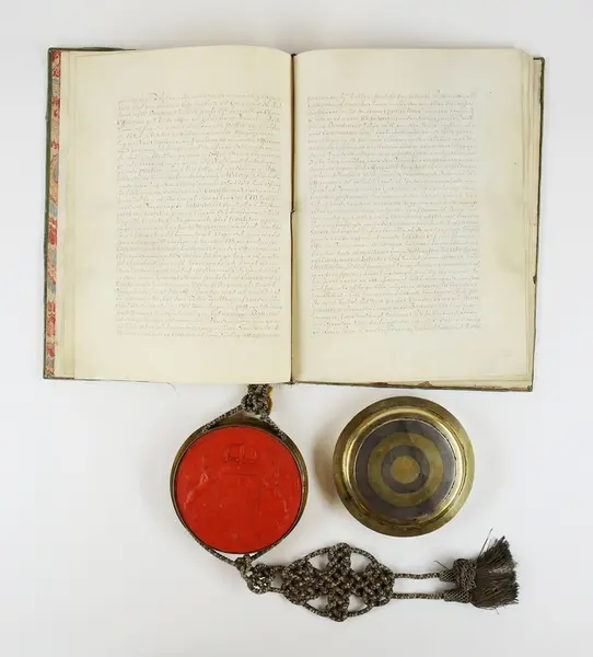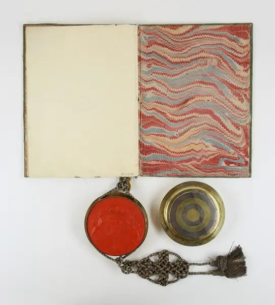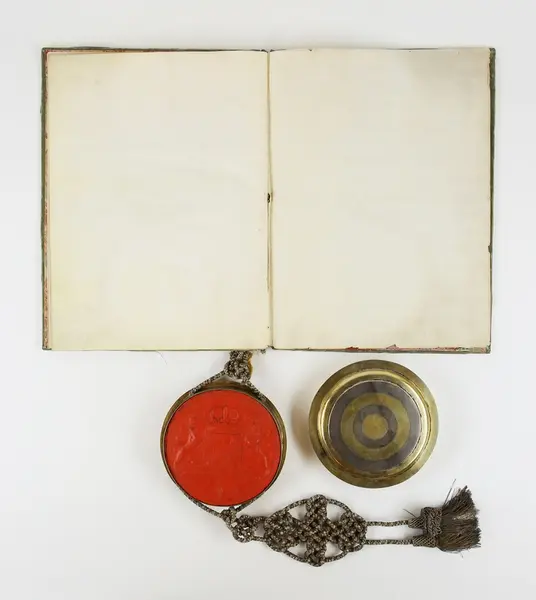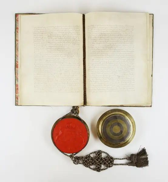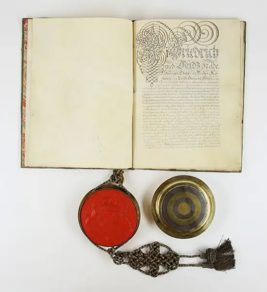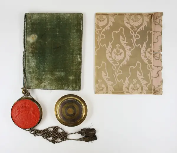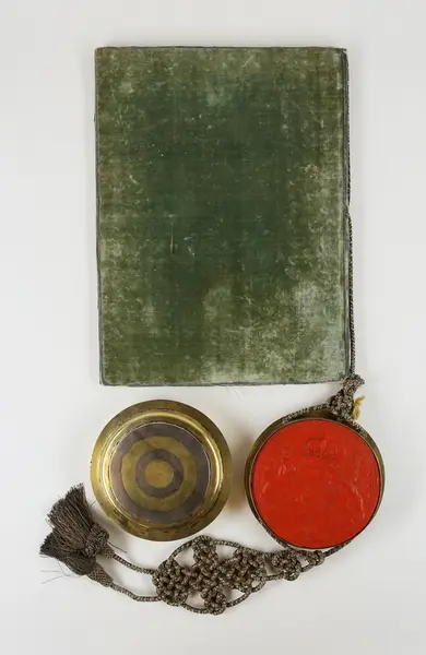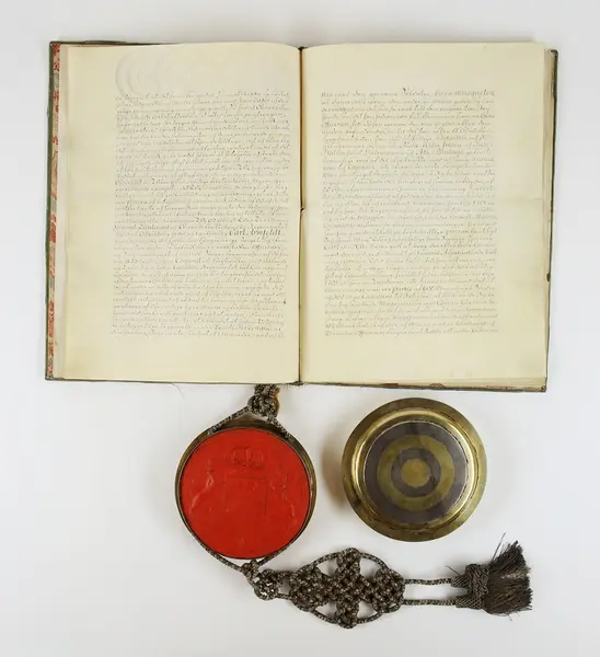 "Friherrebrev. För generallöjtnanten Carl (Gustaf) Armfelt, utställt 5/7 1731. Pärmen utvändigt klädd med ljusgrön sammet, invändigt med turkiskt papper. Kapselns snörmakerier av silvertråd. Bladen av pergament utom för- och eftersättsbladen. Kapseln, med svenska riksvapnet i rött sigillvax, är av delvis förgyllt silver och gjord 1734 i Stockholm av guldsmeden Cornelius Zitski. G. enl. testam. förordn. 29/6 1928 ab friherre Gustaf Armfelt, Kulla gård, Odensvi. Mottagen 3/12 1957."