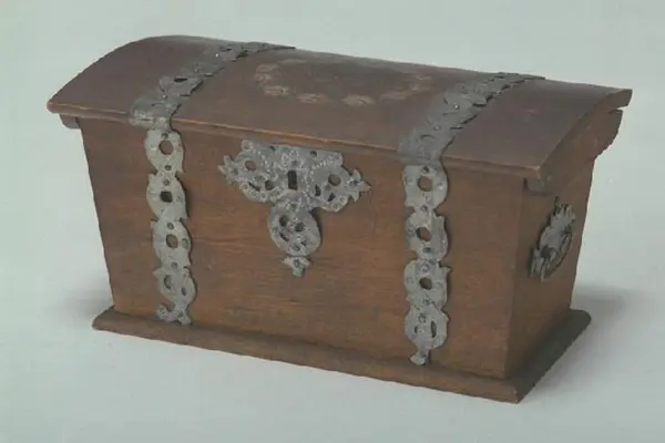 Utvändigt prytt på lock och sidor med utstansade beslag av järn, silverfärgad yta, nyckelskylt och bygelhandtag av på gavlarna.