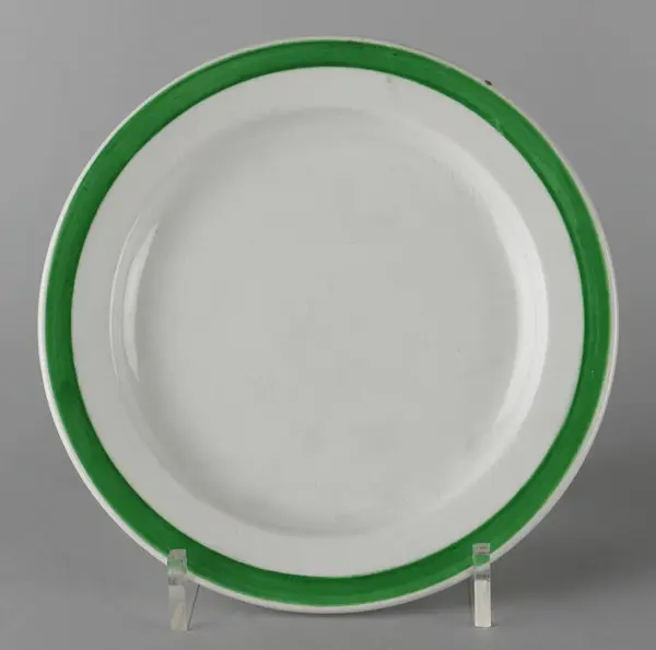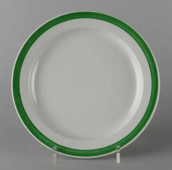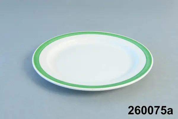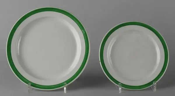 "Assietter, 2 st, av porslin, dekor som föregående. färgstämpel: 'GUSTAVSBERG', stämpel i godset: GUSTAVSBERG/1932/1325/B5. Diam: a)18,2 cm, b) 15 cm. Servis 'Praktika' av prof. Wilhelm Kåge. Gåva 1960 [1961?] Arkitekt Robert Berghagen, Sthm."