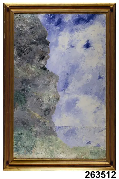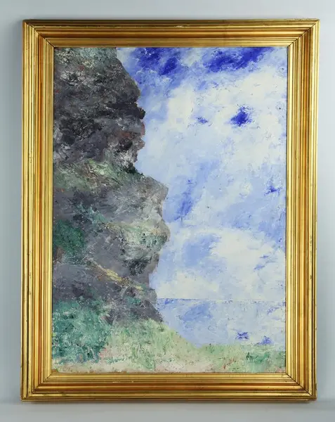 "Oljemålning av August Strindberg, berglandskap; Falaise III. H 112,5 cm, L 76 cm."