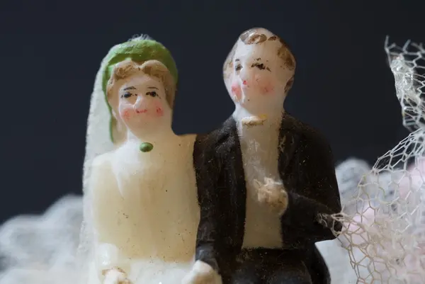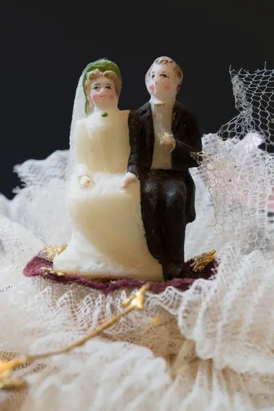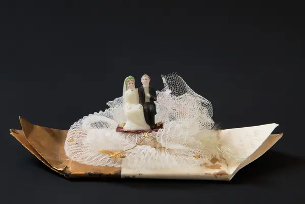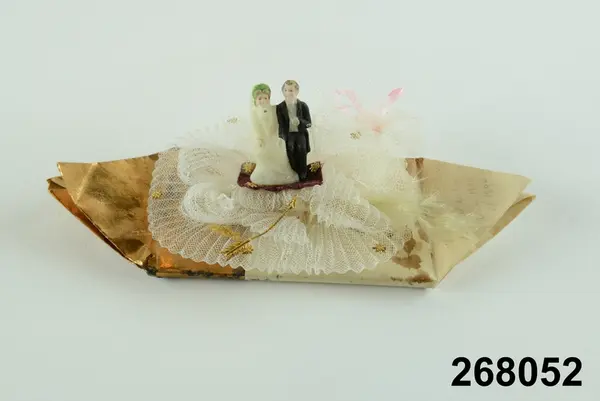"Bröllopskonfekt i guldpapper med dekoration av creperad tyll med guldstjärnor. Brudpar av konstmassa tronar ovanpå. Från Johan Axelsons första eller andra bröllop 1890 el 1894. Bilaga. Gåva den 31.5.[19]65 av skriftställaren Alfhild Axelson, Piteå."