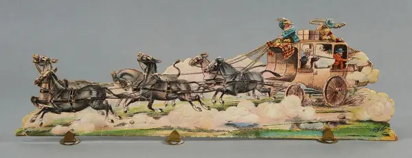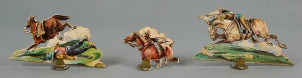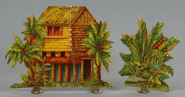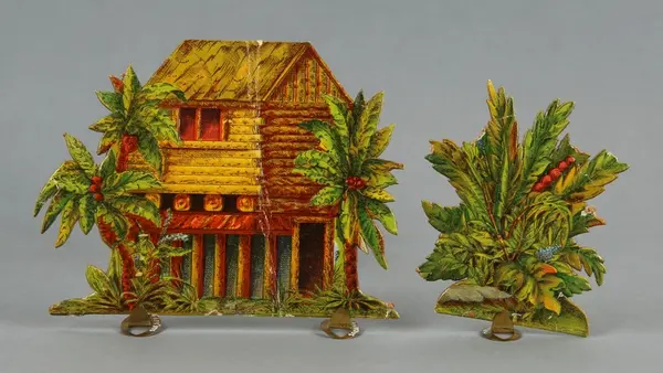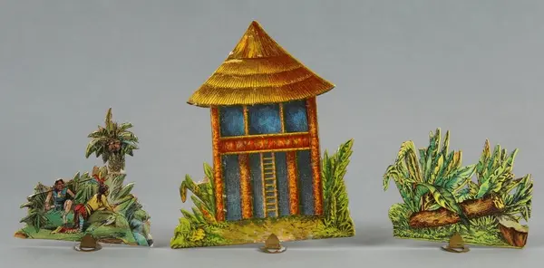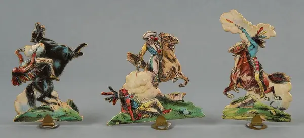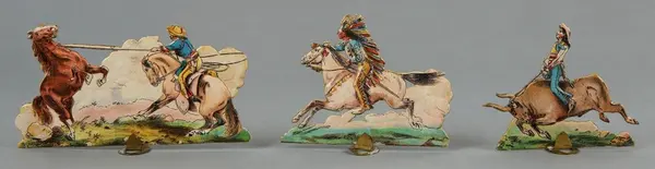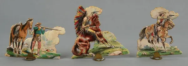 "LEKSAK, leksakskulisser föreställande blockhus, indianhydda, diligens, indianer, ryttare mm, 18 lösa bitar förfärdigade av reliefpressad kartong med pålimmat tryck i flera fäger, H 5-12 cm. Tillhörande skiva med 'Buffalo Bill Wild West' trol. lock till en kartong, mått 22,5 x 32,5 cm. 3 st. stöd av metall. Gåva till givaren omkring 1908."