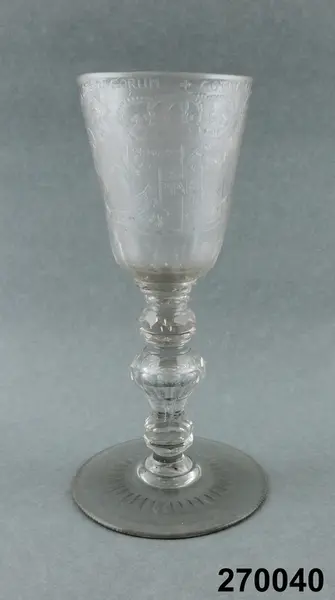Pokal, glas; på rund fot, ben med tre vulster, slipad dekor, på kupan graverat svenska riksvapnet samt Hessen-Cassels vapen; inskr. 'FRIEDERICUS:DEI:GRATIAS:SVE:CORU...
