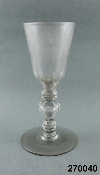 Pokal, glas; på rund fot, ben med tre vulster, slipad dekor, på kupan graverat svenska riksvapnet samt Hessen-Cassels vapen; inskr. 'FRIEDERICUS:DEI:GRATIAS:SVE:CORUM:GOTHORUM:VANDALORUM:QUE:REX'; på motsatta sidan sol; spår av glassjuka. 23,8 cm, Diam kupa 9,5 cm. Kungsholms glasbruk."