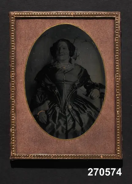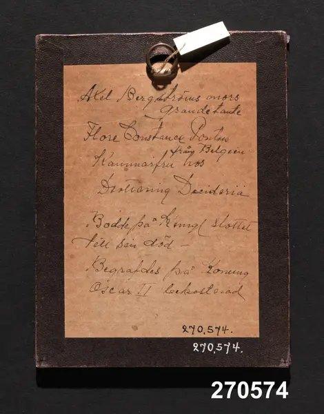 "Daguerreotypi, ovalt, porträtt av dam; uppsatt på brunaktigt papper, glas, kantlist av pressat guldpapper; på baksidan 'Axel Bergströms mors grande tante Flore Constance Pontus från Belgien. Kammarfru hos Drottning Desideria.' etc. H 16 cm, Br 12,2 cm. Test. [gåva] 17/1 1967 av fru Mathilda Bergström, Stockholm."