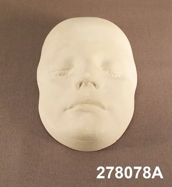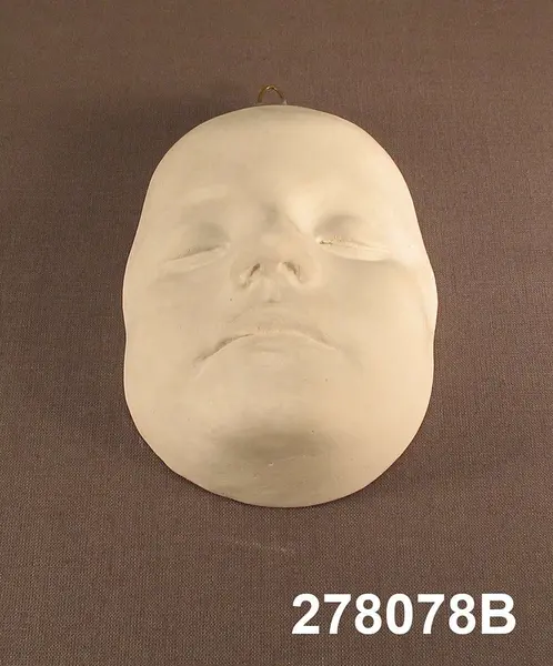 Dödsmask efter Axel Bernhard Hedlund – en 8-årig pojke* som 1869 drunknade i Eskilstunaån. Hans otröstliga föräldrar lät göra två dödsmasker av honom, denna omedelbart efter döden, med ögonfransar som fastnat i gipset. Den andra masken gjordes några dagar senare. Föräldrarna sparade också föremål för att hålla minnet av sonen levande, bland annat hans hårlock och hans första skrivbok.