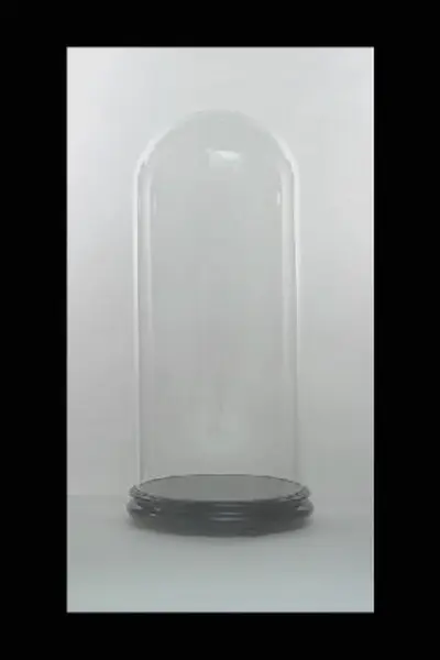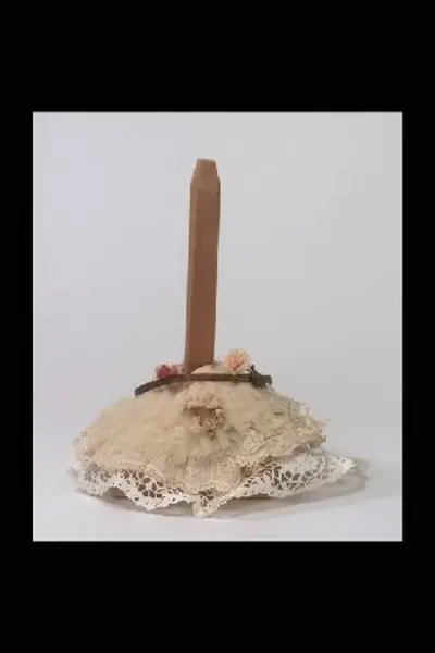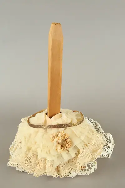 Dockan står på ett runt svart podium av trä med tre platta kulfötter och hög cylinderformad glaskupa. På podiet en lös ställning av obehandlat trä med fyrkatnig bas och rakt uppstående pinne, klädd med vitt crepe, tårtpapper och pappersblommor, vit spets ligger ihopknycklad under tårtpapperet.