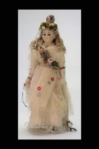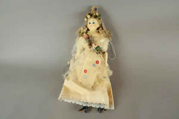 Damdocka, huvud med sköld och nedre delen av armar och ben av (troligen) biskvi täckt med vax. Blå ögon av glas, målade anletsdrag, riktigt blont hår. Stoppad kropp täckt med vitt tyg. Iklädd brudklänning av vitt linne täckt med vit tyll (starkt nedbruten). Runt höger överarm och vänster armled ring av guldpapper, bägge dessa har trol. ursprungligen suttit vid klänningsärmarna. Klänningen dekorerad med spetsar och runt midjan brett, vitt band broderad med blommor. Diagonalt över överkroppen tygblommor och blad. På huvudet diadem av tygblommor och blad och krona av gulmetall med slipade glasbitar. Brudbukett av tygblommor i höger hand. Runt halsen halsband av glas och pärlor (ej äkta) och kors. I midjan berlock av metall och celluloid i vilken det sitter ett foto på en dam (ev tillverkaren av kläderna ?)
