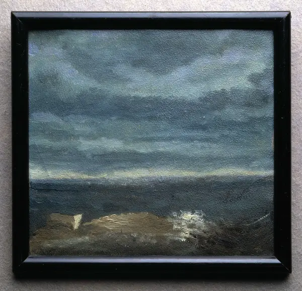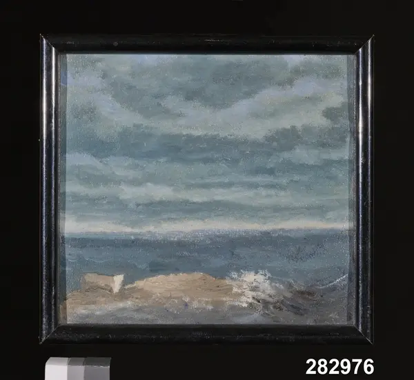 "Tavla, olja på papp; svart slät ram; gråbrun klippa överspolad av stormigt blågrått hav; ovädersmoln i olika grå nyanser; papperslapp med uppgifter. Mått 18,5 x 17,5 cm. August Strindberg, Sandhamn, 1873, 'Klippa och hav'. Test[amentarisk gåva] 25/4 1972 av fru Elsa Åhgren, Stockholm."