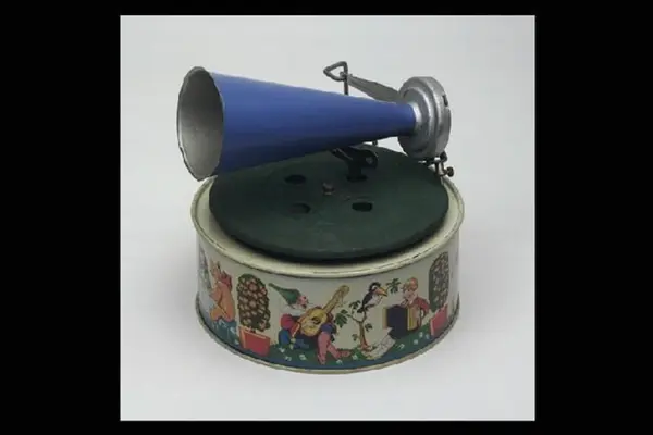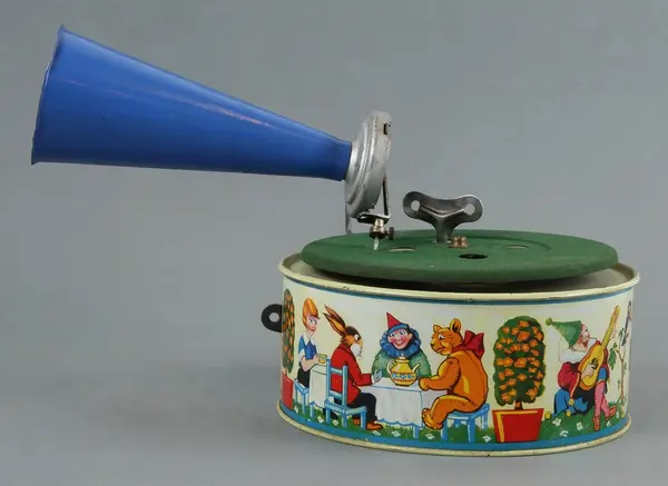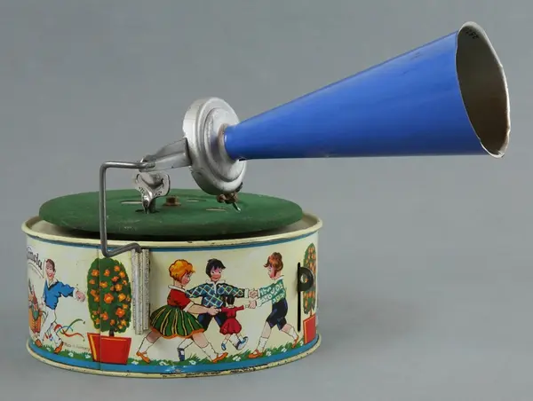 Trattgrammofon, leksak, av bockad och lackerad plåt, rund ljuddosa med bilder av lekande och musicerande barn, djur och clowner i litografiskt tryck mot ljusgul fond, ovanpå denna en roterande platta, täckt med grönt textilstoff, rörlig arm med nål och blå tratt, stoppspak på ljuddosan, lös nyckel. Märkt: "Keimola / D.R.G.M. Registered. / Made in Germany".