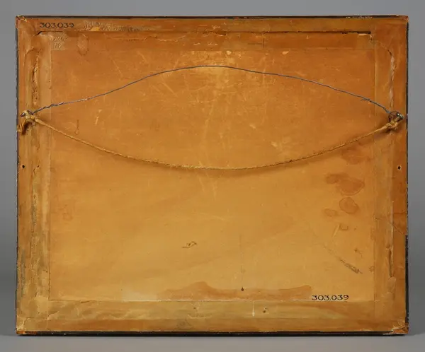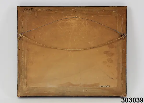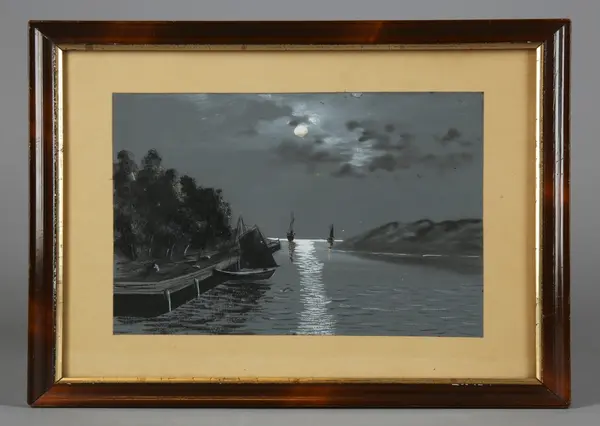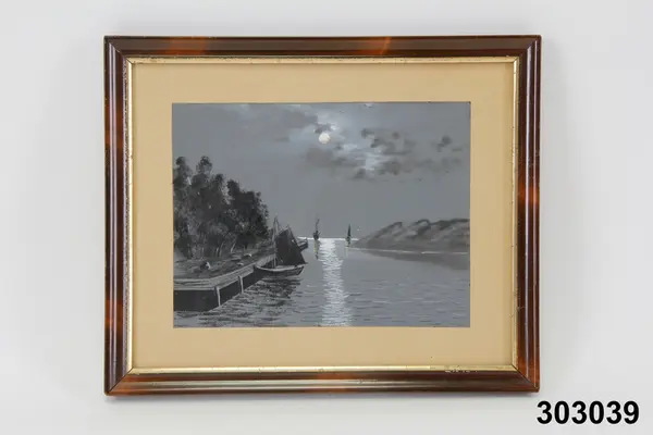 "Tavla, akvarell, olja. 1800-talets slut. Glasad och ramad målning i grått och vitt. Sjölandskap i månsken, gaffelriggad båt vid kaj, två fartyg på redden. Brun målad ram, närmast motivet guldfärgad kant. Har tillhört frk Edit Andersson (1894-1978), dotter till verkstadsarbetare Per Andersson (1866-1932) och hans hustru Amanda (1866-1942), Stockholm. Uppgifter om familjen och hemmet, samt förteckning över det inköpta bohaget finns som bilaga. Se även foto och anteckningarn från besök hos Edit Andersson, KU nr... AT/1978" (Annika Tyrfelt)