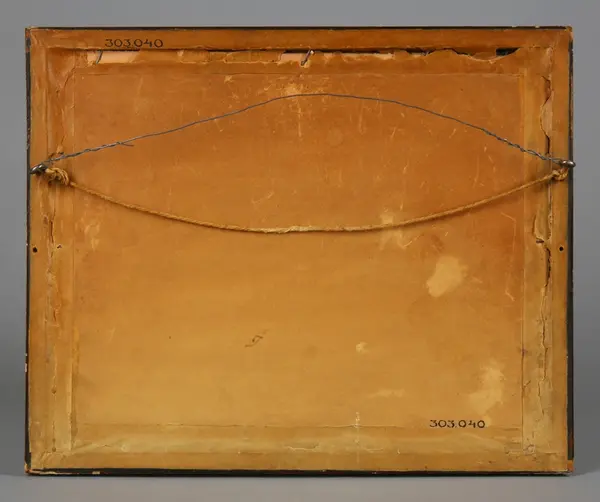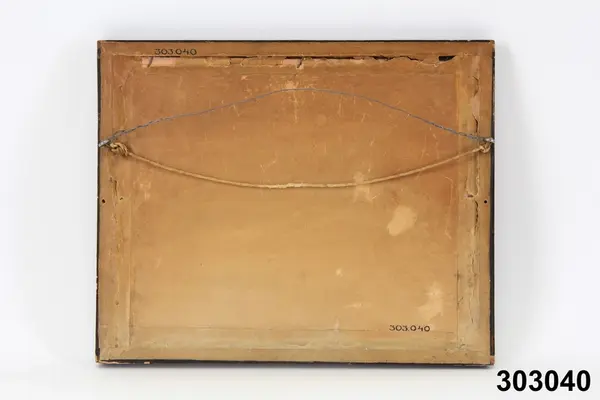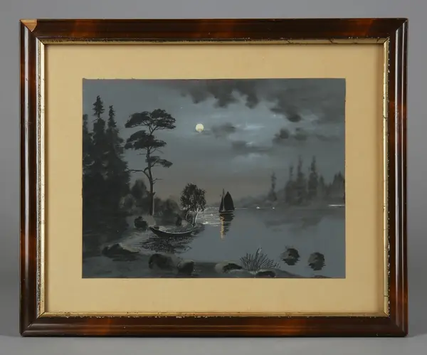 "Tavla, akvarell, olja. Glasad och ramad målning i grått och vitt. Sjölandskap i månsken. Vi stranden t v en roddbåt, i bakgrunden en båt med gaffelrigg. Brun målad ram, närmast motivet en guldfärgad kant. Har tillhört frk Edit Andersson (1894-1978), dotter till verkstadsarbetare Per Andersson (1866-1932) och hans hustru Amanda (1866-1942), Stockholm. Uppgifter om familjen och hemmet, samt förteckning över det inköpta bohaget finns som bilaga. Se även foto och anteckningarn från besök hos Edit Andersson, KU nr... AT/1978" (Annika Tyrfelt)