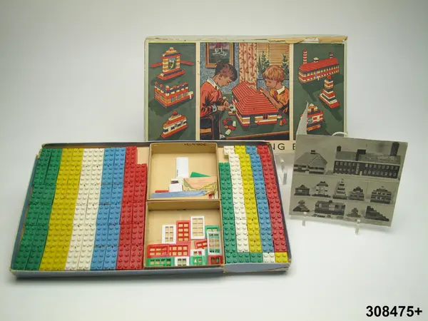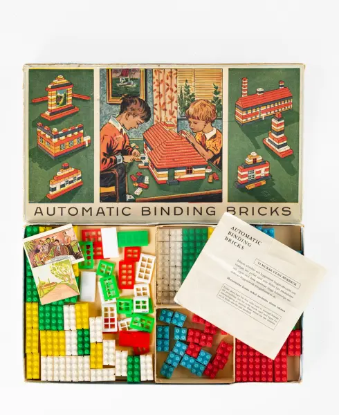 Byggsats med Automatic Binding Bricks, formgjutna byggbitar av plast, en tidig modell av leksakstillverkaren LEGO:s murstenar. De färgglada bitarna är till för att roa barn och stimulera till bygge av olika husmodeller. Medföljande bruksanvisning tryckt i Värnamo 1950.