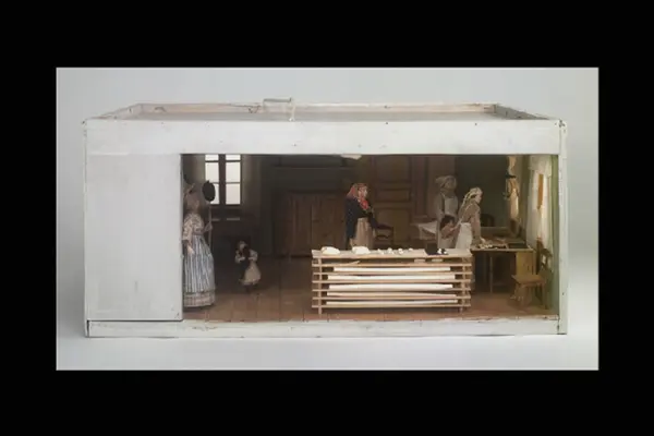 Till vänster vedspis (trä) med vit spiskåpa. Baktill i rummet skänk och bord, till höger slagbord med bakplåtar. Flera stolar (bl a av Lindometyp) i rummet. 6 st dockor, fyra kvinnor (av plast) i sekelskifteskläder och två små flickor (av massa, en hållande en katt). Framtill i rummet, staplade på varandra, träskivor med tyg och bröd av massa (brödet står på jäsning).