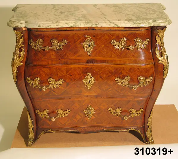 Anm: Vid intagningen till museet saknades nedre mittbeslaget, höger bärhandtag var trasigt samt skivan spräckt. Skivan lagades i mars 1983 av konservator Torsten Sylvén. En identisk byrå finns i privat ägo, Stockholm.