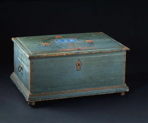 "Kista med kistebrev, trä. Rektangulär med plant lock. Målad med turkosblå lasyr med röda hörn. På locket blomsterkrans med CID, Cecilia Larsdotter. Inuti fastklistrat kistebrev 1. Circus, 2 Ecce Homo 3 Mater dolorosa 4 Kristus som vinträdet 5 Franskt kopparstick 6 handteckning Josef och Faraos drömmar. 90x60x40 cm, tidigare ägare Wilhelm Eriksson i Näsviken."