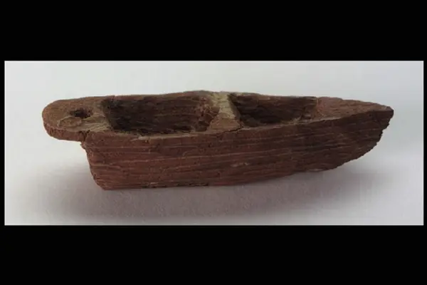 Leksaksbåt täljd av tallbark. Spetsig för, rundad akter. Inredd med två sittbrunnar och masthål. Rundad botten.