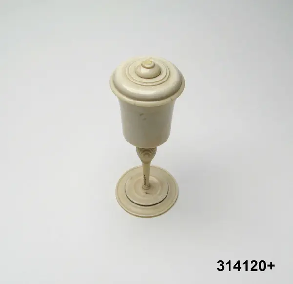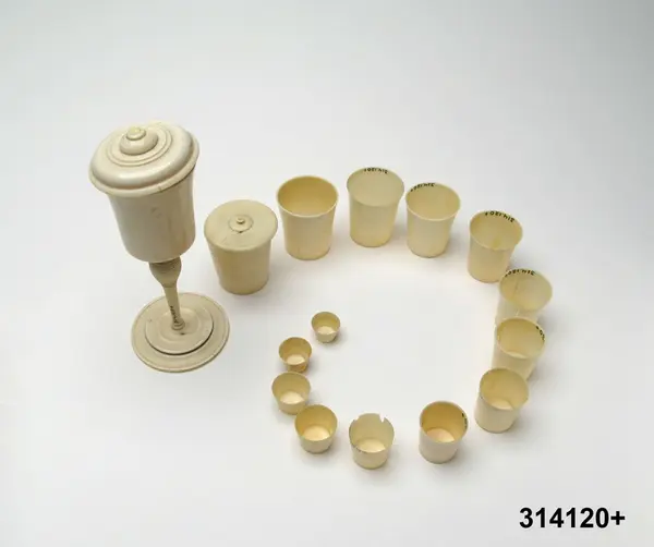 Pokal av ben med sexton små bägare ett innerlock och ett ytterlock. Foten gängad på benet. Tre av bägarna har det yttre locket skadat, liksom avslag på benet.