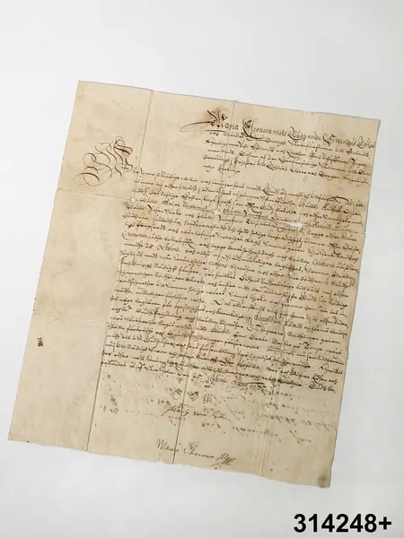 "MCLXVI [tidigare depositionsnummer]. Brev, 2 st, papper, 1635-09-25. Två brev, original samt avskrift. Ställt till Anders Olson (Anders Olofsson Oxehufwud) från änkedrottning Maria Eleonora. Av henne egenhändigt underskrivet, Stockholm den 25 sept. 1635, med tack för inbjudan till bröllopet som hon ej kan bevista. Bröllopet, den 25 okt. 1635, stod mellan Christina Oxehufwud och Erik Ribbing samt mellan Elisabeth Oxehufwud och Johan Stake. Dep. 1948-11-10 Kapten Olof A Oxehufvud MCLIX-MCCCXLVII. Testamentarisk g 1988-06-07 Anders Gustaf Fredrik Oxehufwuds dödsbo, La Grange, Texas, USA. 1988-12-19 HJ."