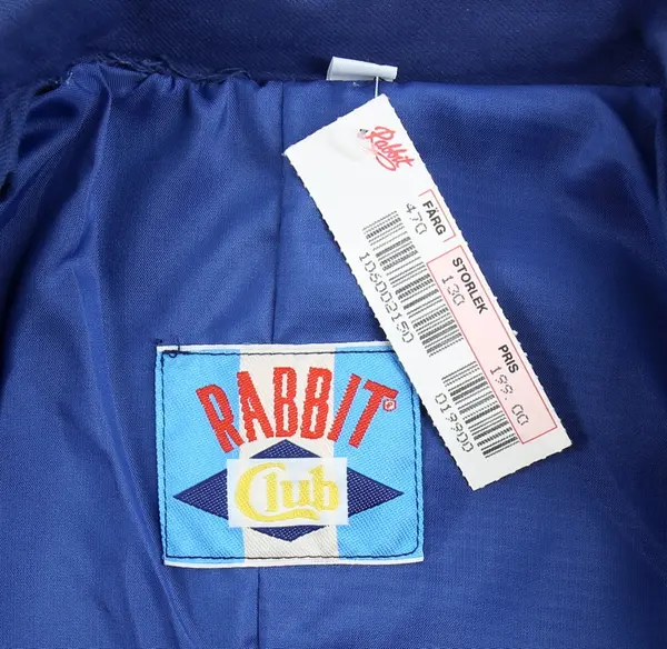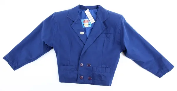 "Fabriksny. Oanvänd. Utvald som ett av de mest typiska plaggen våren/sommaren 1987 av personalen på JC, Skärholmen. Bärs förslagsvis m.m blårandiga långbyxor inv.nr. 315.386, vit skjorta m. turkosa ränder inv.nr. 315.397, blått bälte inv.nr. 315.390, ljusblå slips inv.nr. 315.389, samt skor av loafermodell."