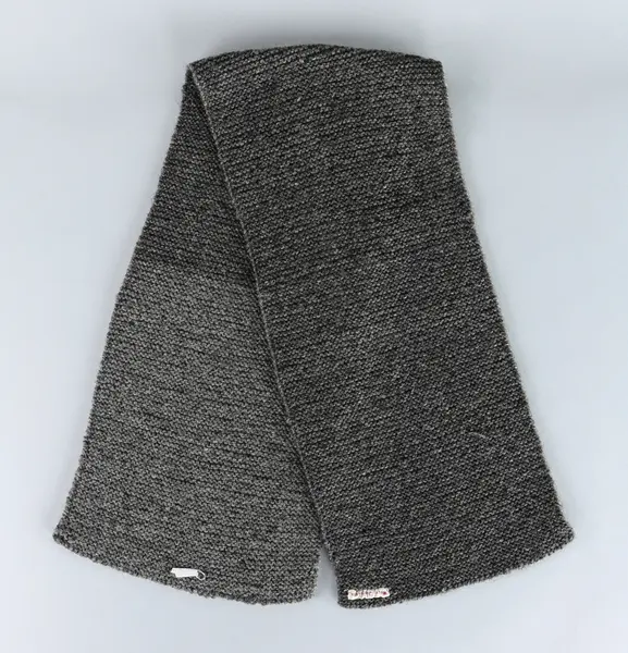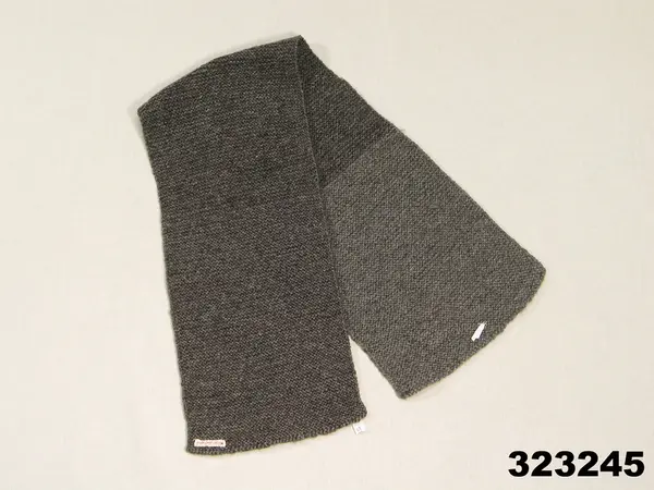 Rak halsduk stickad av grått ullgarn i rätstickning. Märkband med namnet Wolff Justusson i rött.