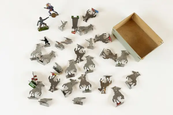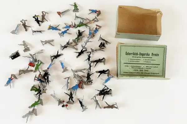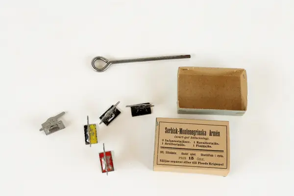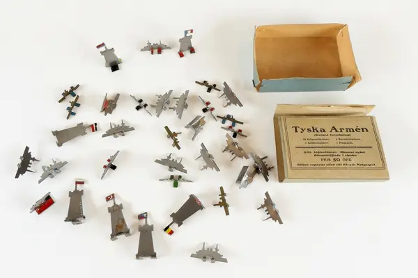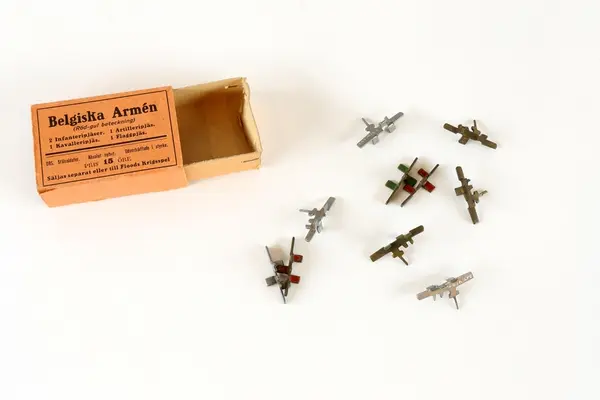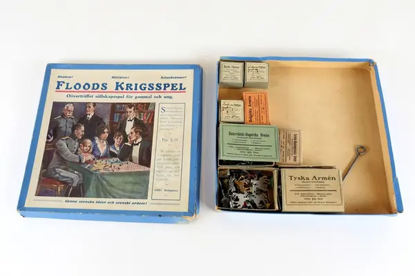 "Spel med etikett på lockets ovansida: bild av vuxna och barn som sitter vid ett bord och spelar. Två av de vuxna klädda i uniformer. Text: Ungdom! Militärer! Schackvänner! Floods krigsspel. Oöverträffat sällskapsspel för gammal och ung. Spelet spelas med pjäser betecknande infanteri, kavalleri och artilleri samt fartyg. Spelet ska även innehålla krigskarta, regler för spel med tärning eller efter schackidén. Kartongen innehåller åtta askar för pjäser av stål: tyska armén, belgiska armén, ryska flottan m.fl. De facto innehåller askarna inte exakt vad som anges. Detta kan bero på att pjäserna såldes separat eller till Floods krigsspel. Spelregler saknas.