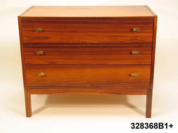 b:1+) Byrå med tre lådor samt b:2+) hyllöverdel med tre flyttbara hyllplan.