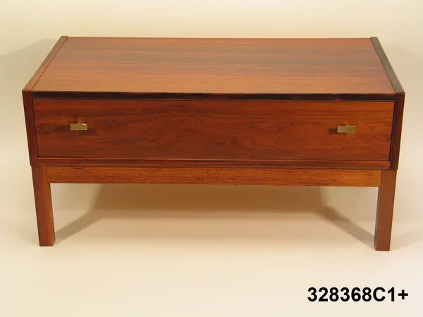 Hyllan består av fyra sektioner med hyllor löst placerade på underredet. Skåp- och byråunderdelar med ryggar av masonit, fastnitade. Kvadratiska ben, fastskruvade i underredet. Lådsidor m.m. av björk och lådbottnar av vi...