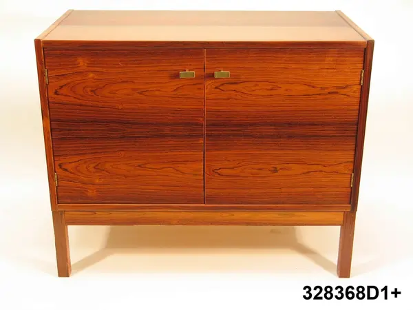 d:1+) Skåp med två dörrar samt d:2+) hyllöverdel med 1 flyttbart hyllplan. Överst vitrindel med två skjutdörrar av glas (höjd 53,5 cm, bredd 41,5 cm), därunder ett barskåp med spegel som bakvägg, utrymme för flaskor till vänster och två glashyllor (48 x 19,5 cm) till höger. Barskåpet med fällbar klaff med lås. Belysning monterad i skåpets överkant.