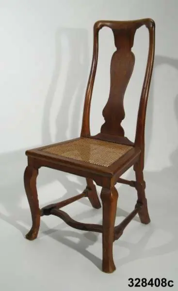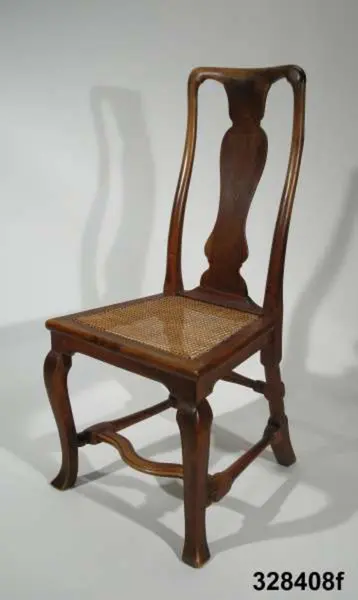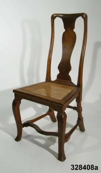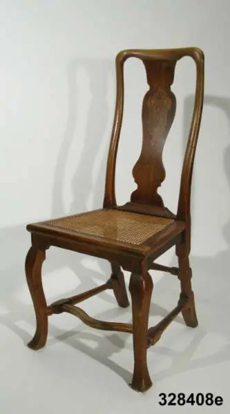 Stol, 6 st (a-f), England, 'Queen Anne', omkring 1720, av valnöt. Hög, balusterformad ryggbricka med inlagd (inkrusterad) dekor av ljusare träslag. Cabriolformade ben och svängt fotkryss med svarvade sidoslåar och bakre tvärslå. Sits med låg sarg, rottingflätad (rottingflätningen nygjord omkring 2002). Tillverkarinitialer inslagna på ben, ryggståndare och baksarg: