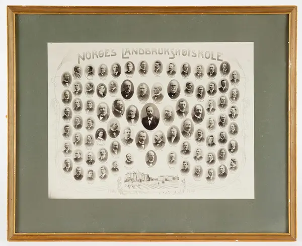 Innrammet portrettgalleri med personale og studenter fra Norges Landbrukshøiskole i perioden 1908-1910. Montasjen består av 82 ovale portretter montert på ei rektangulær flate med skolens navn i overkant og ei tegning av sentrale skolebygninger under. Ytterkantene er omrammet av border, med stilliserte kornstrå (bygg og havre) og barkvister (gran og furu). Portrettenes posisjoner og størrelser later til å speile de ulike personenes posisjoner i skolesamfunnet. Sentralt i montasjen er det et portrett av direktør Nils Knutsen Ødegaard omgitt av skolens overlærere, lærere, assistenter og med studentene på «ytterflankene». Portrettenes formater avtar fra sentrum mot periferi. Skogbruksstudentene er plassert på venstre side, jordbruks-, hagebruks- og utskiftingsstudetene på høyre side.